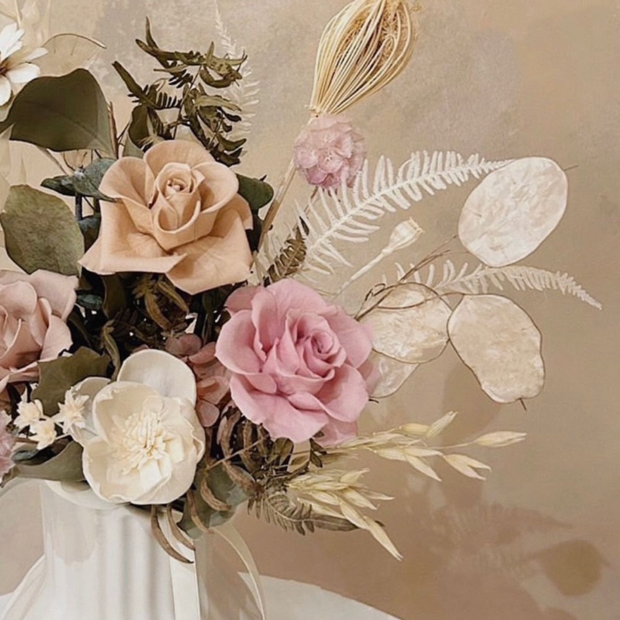 - 永生玫瑰、太陽玫瑰、不凋繡球、尤加利葉、蕾絲花、手工瑪格特、芒萁、松蟲果、富貴葉