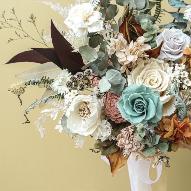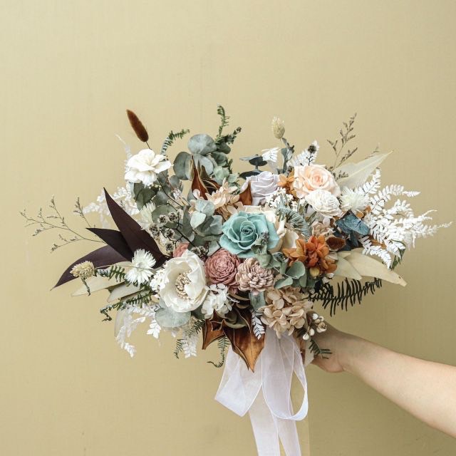 - 永生玫瑰、不凋繡球、尤加利葉、太陽玫瑰、虎眼、芒萁、兔尾